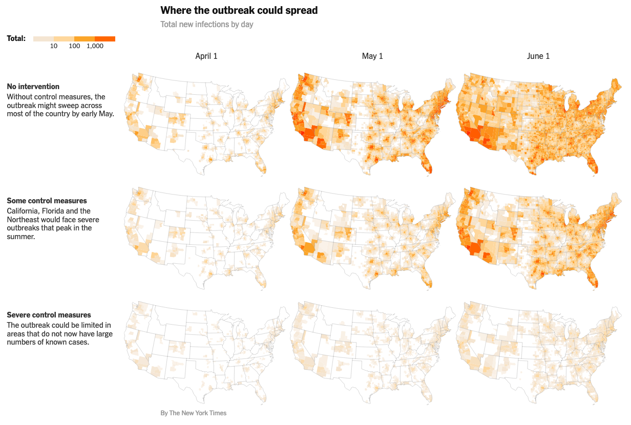 の3つのシナリオで、アウトブレイクの広がりを推測したチャートをNew York Timesが記事化しています。